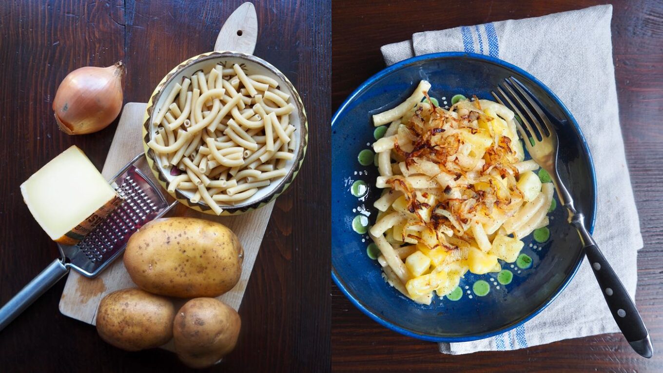 Pfeffer | würzen. Die Älplermagronen in eine Gratinform geben und die gerösteten Zwiebeln darüber verteilen. |
