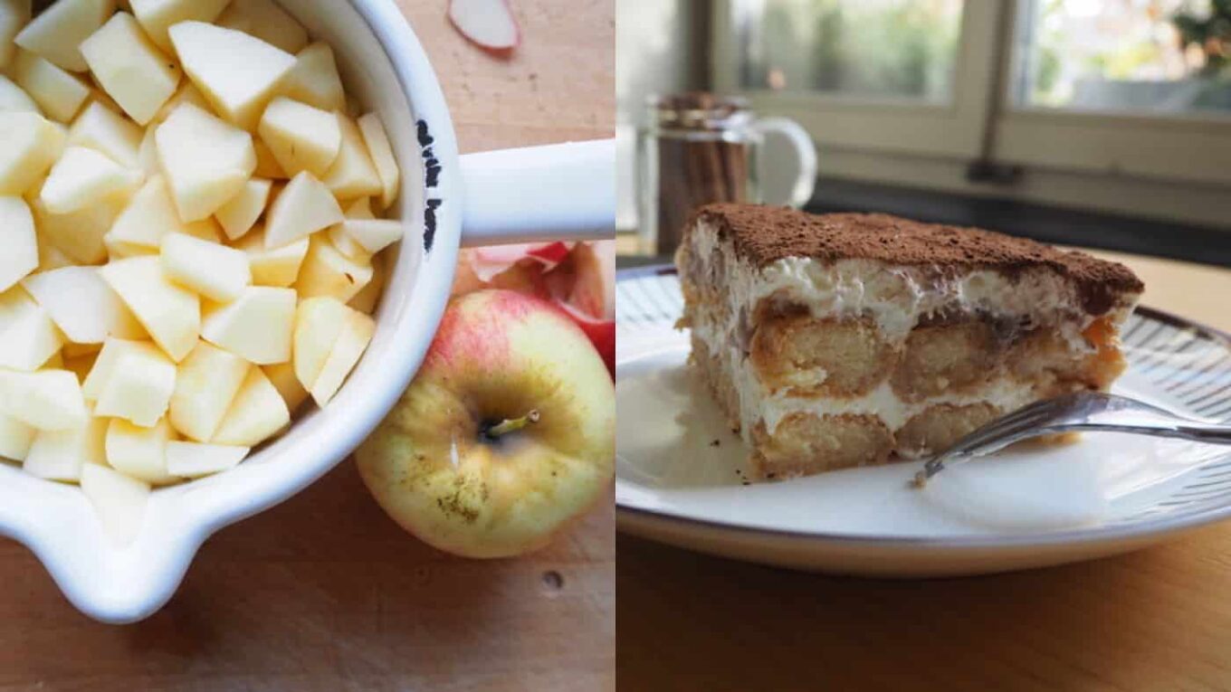 200g Löffelbiskuit | die Hälfte davon mit der Zuckerseite gegen unten in eine Auflauf- oder Gratinform auslegen. Mit der Hälfte des Apfel-Zimt-Saftes beträufeln. Danach die Hälfte der Mascarpone-Quarkcrème auf den Löffelbiskuits verteilen. Anschliessend die zweite Hälfte der Löffelbiskuits (Zuckerseite nach unten) auf der Crème verteilen. Mit dem restlichen Apfel-Zimtsaft beträufeln bis die Biskuits die Flüssigkeit aufgesogen haben. Den ausgekühlten Apfel-Kompott darauf verteilen. Die restliche Crème darauf ausstreichen. Das ganze anschliessend zugedeckt vier Stunden im Kühlschrank ziehen lassen. |