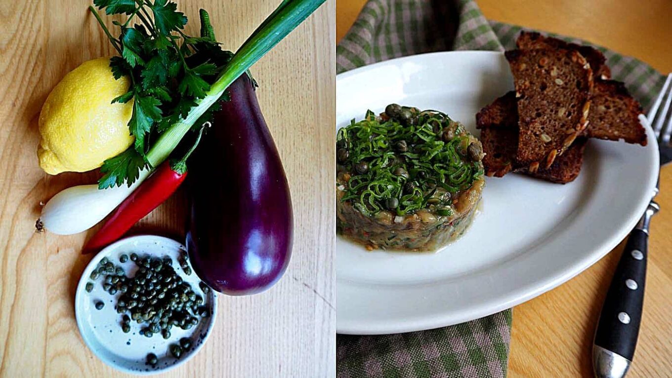 Umso mehr braucht es jetzt erfrischende Menus, wie zum Beispiel dieses Aubergine-Tatar. Das Gute daran: Auberginen sind leicht bekömmlich und sehr gesund.